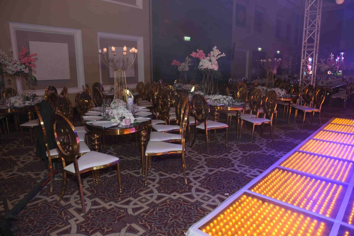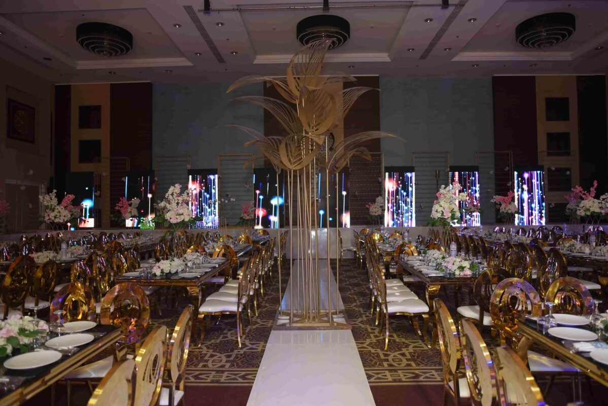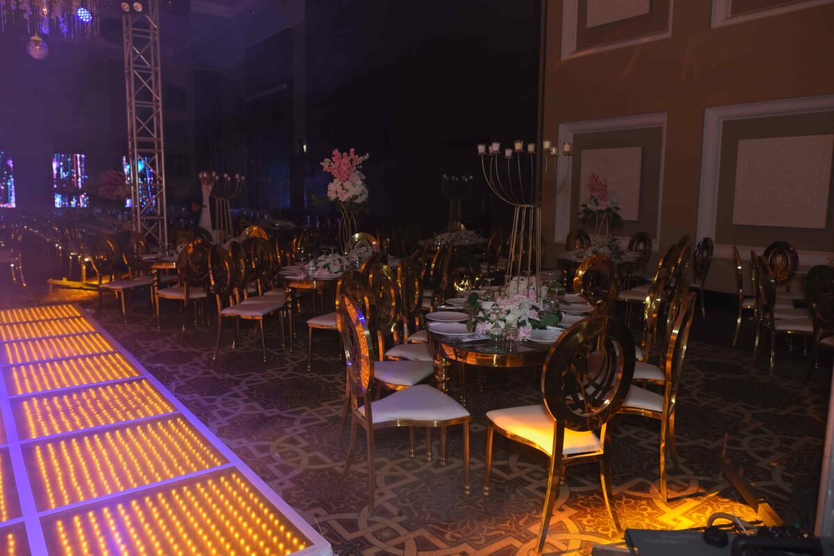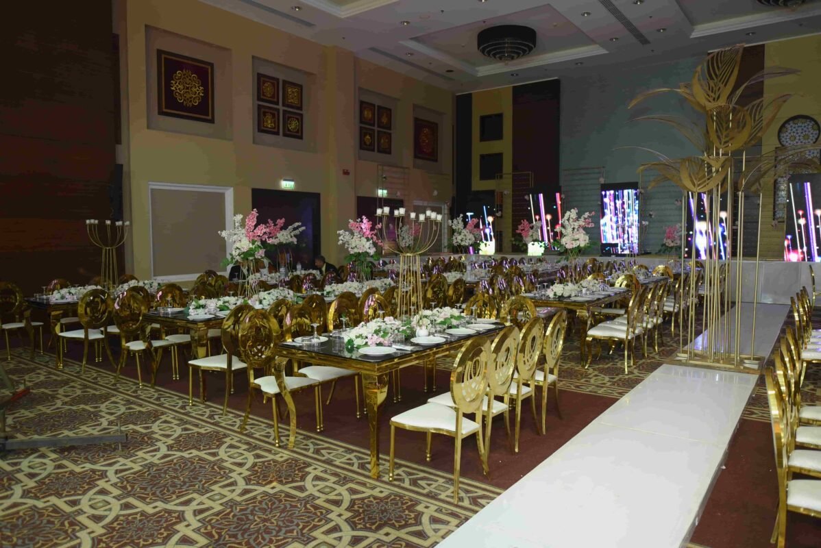 تصميم فاخر: قاعة بديكورات أنيقة وإضاءة جذابة تضفي جواً رومانسياً ومميزاً على الحفل.