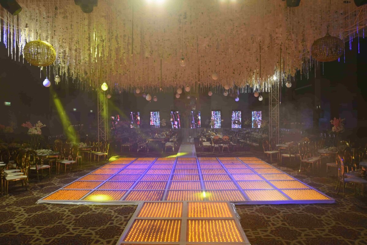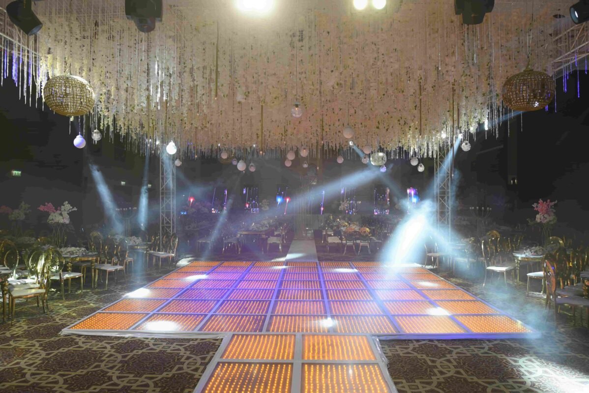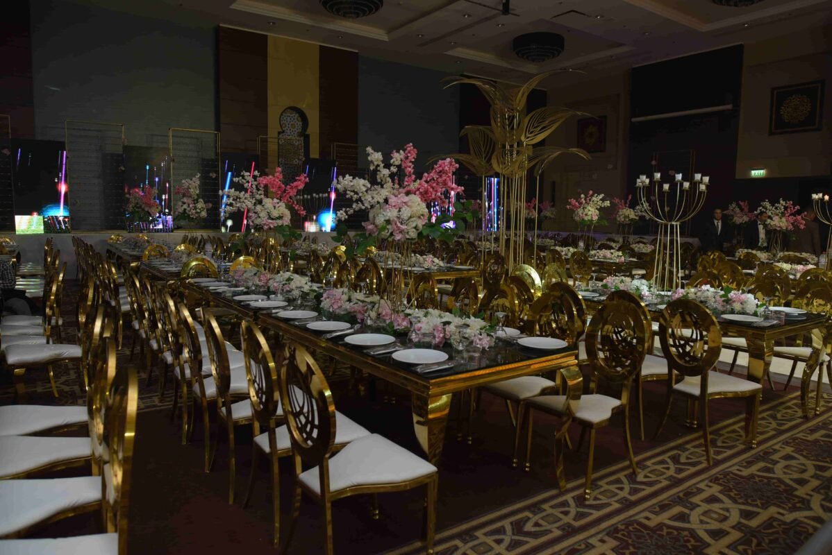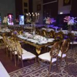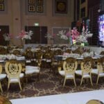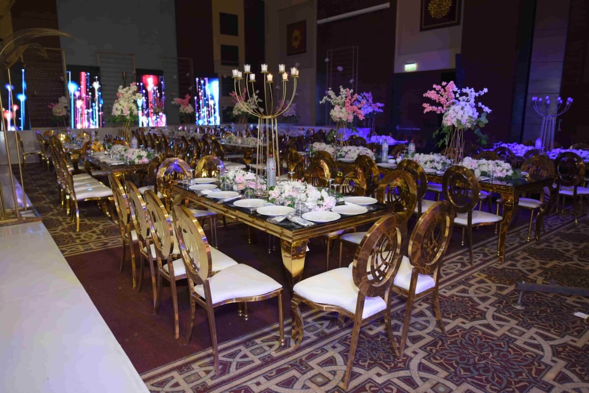 تصميم فاخر: قاعة بديكورات أنيقة وإضاءة جذابة تضفي جواً رومانسياً ومميزاً على الحفل.
