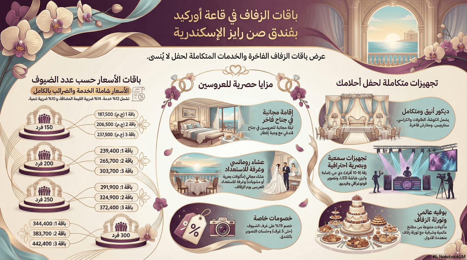 • خيارات متعددة تشمل قوائم طعام فاخرة، ديكورات مبهرة، وترتيبات إقامة مميزة للعروسين والضيوف.