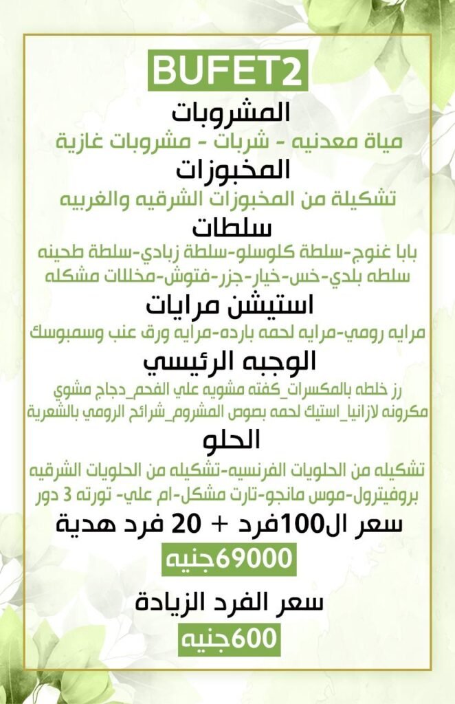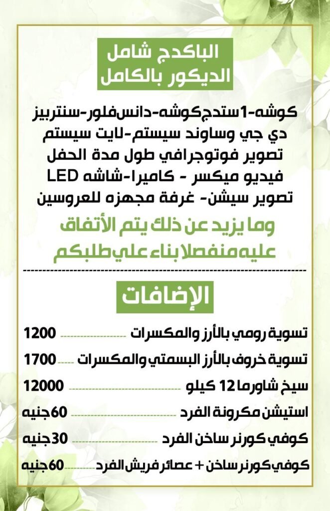 ✅ خدمات متكاملة لحفلات الزفاف: تشمل باقات القاعة تجهيزات البوفيه، الديكورات، الإضاءة والصوت، مع فريق عمل محترف لضمان تجربة لا تُنسى.